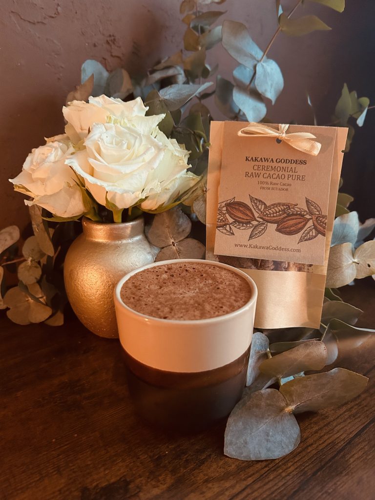 De cacao die ik gebruik voor de ceremonie is 100% rauwe cacao van Kakawa Goddess. Deze cacao is van uitzonderlijke kwaliteit en wordt rechtstreeks van de boeren gehaald. Wat ik er bijzonder aan vind, is dat er vanaf het planten van de boon tot aan de verzending rituelen worden toegepast. Dit sluit helemaal aan bij mijn eigen manier van werken: met eerbied en respect omgaan met het product.